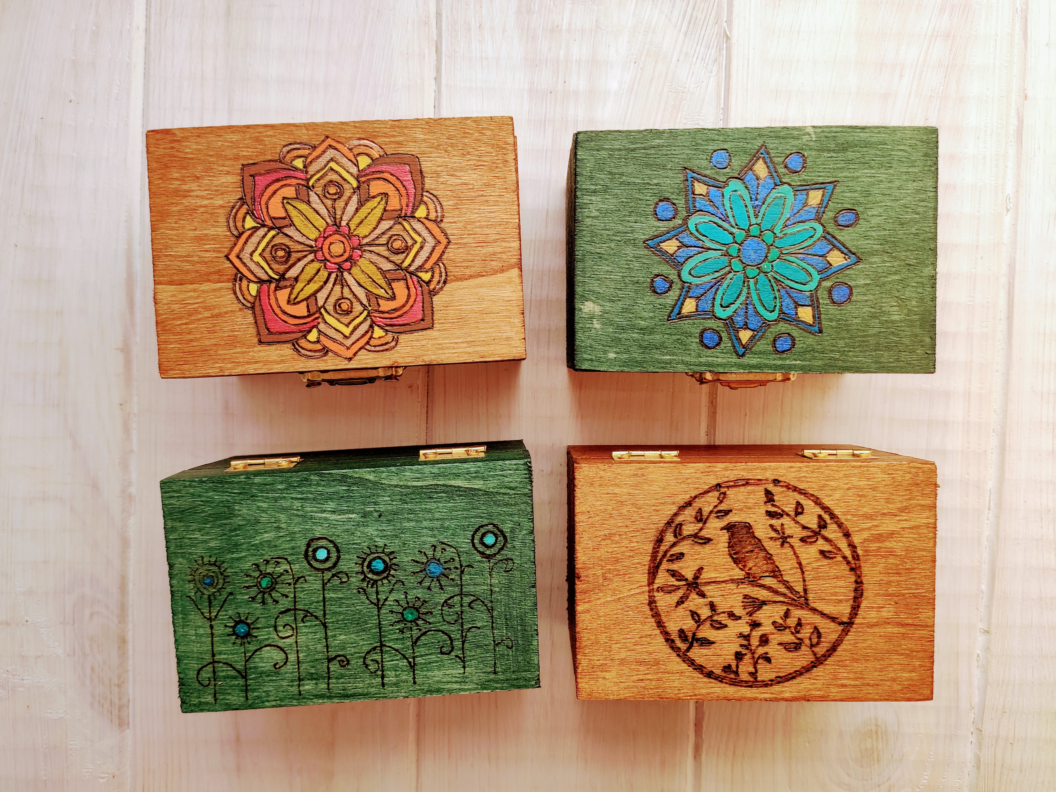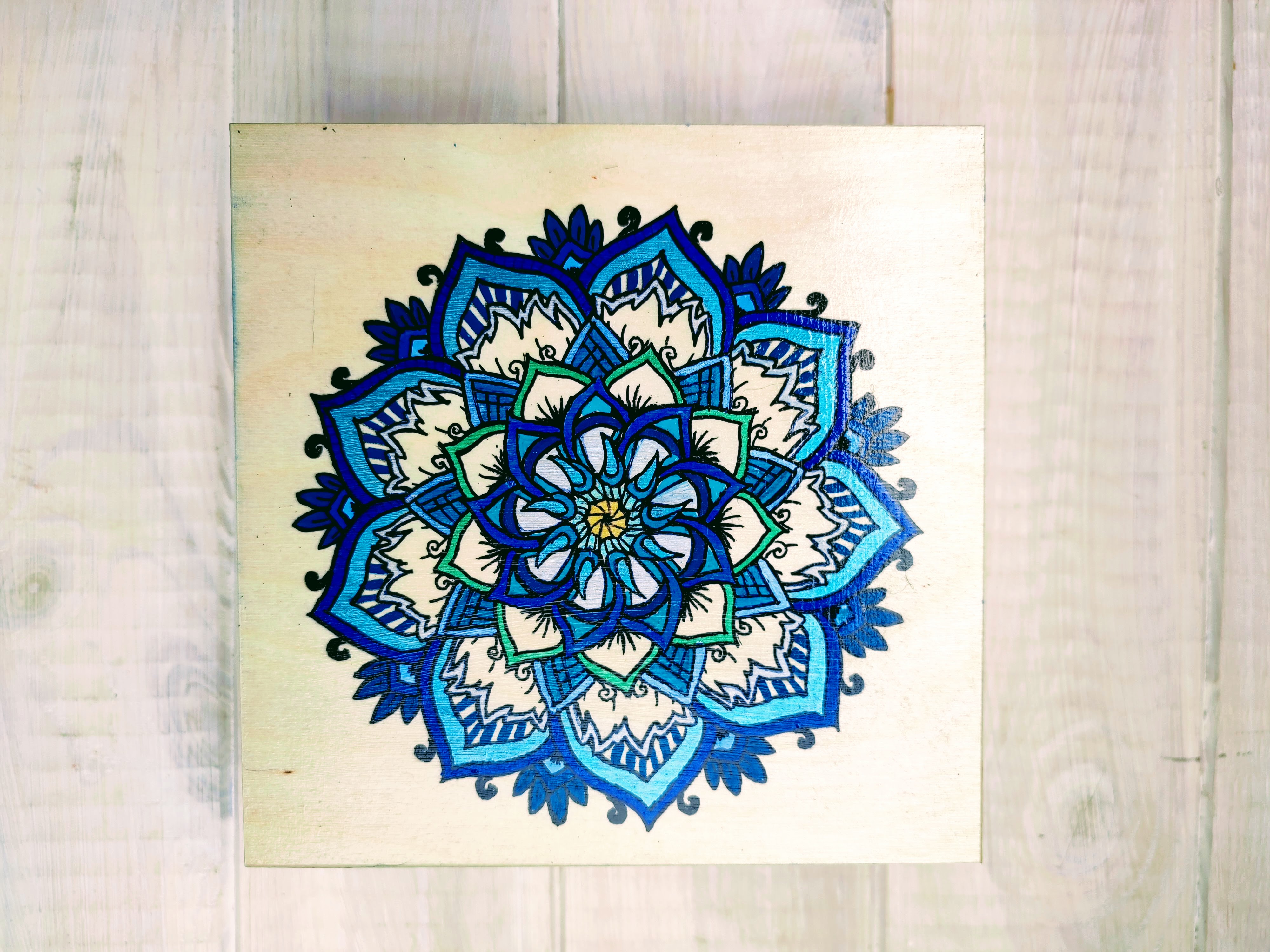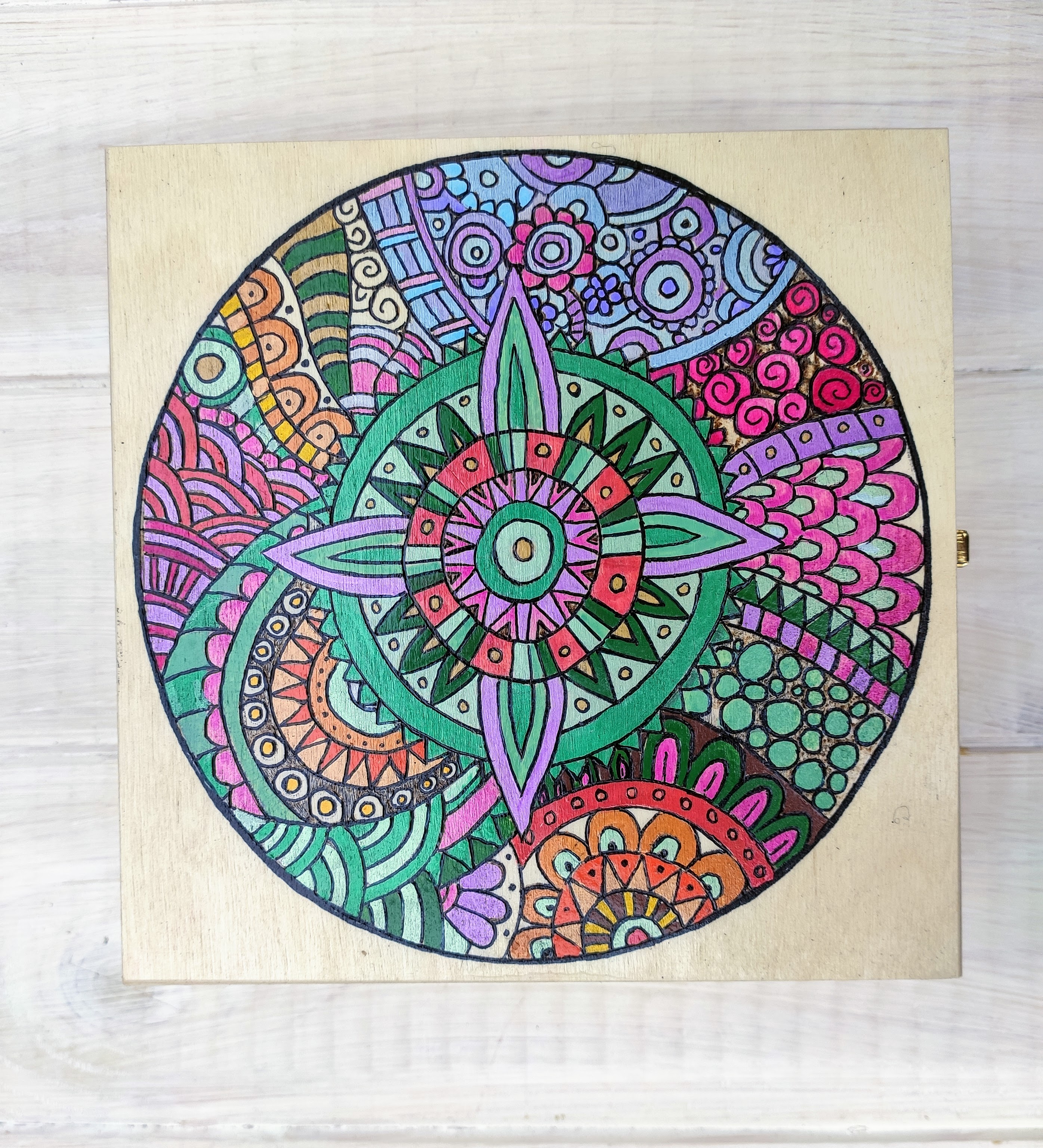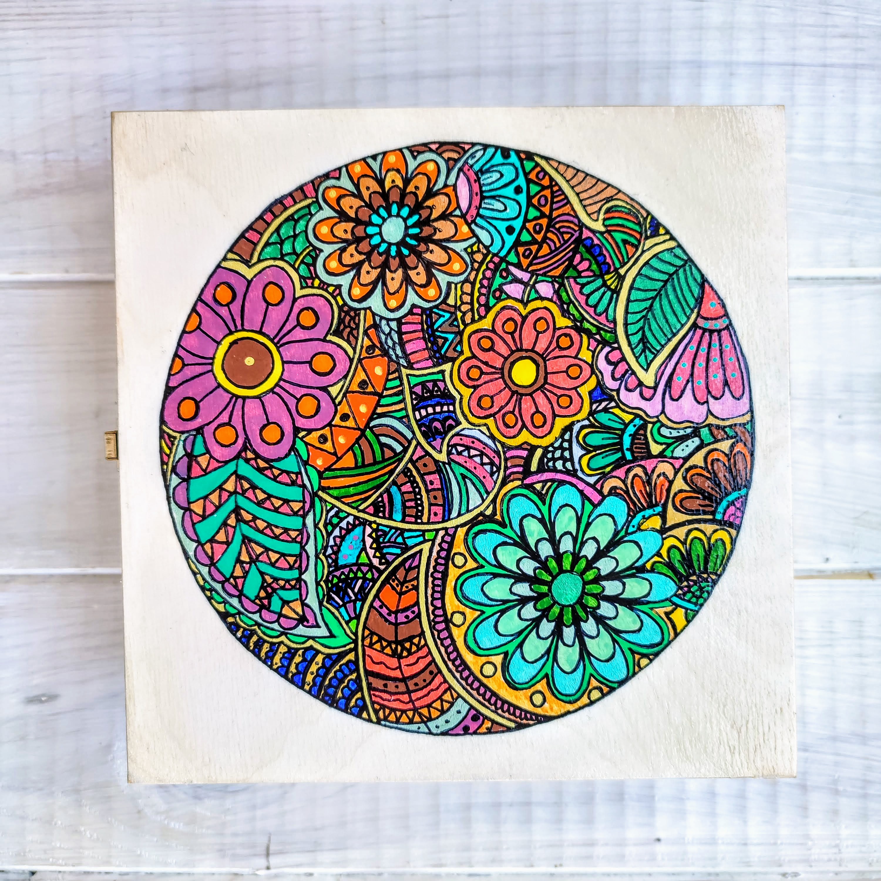 Na malowanych ręcznie drewnianych skrzynkach bardzo często pojawiają się wzory mandali, które sami tworzymy. Pełne koloru, energii. Takie są nasze drewniane skrzynki na marzenia, wspomnienia i pragnienia. Dlaczego akurat mandale? Pewnie dlatego, że mogą mieć wiele znaczeń. Są mandale oczyszczające, występują też mandale wzmacniające określone cechy lub poszczególne obszary ludzkiego życia. W szerokim znaczeniu mandale są diagramami, które ukazują w jaki sposób chaos przybiera harmonijną formę.